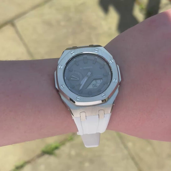 Here We Have The Custom ‘Casioak’. It Is The Casio GA2100 With A Custom Stainless Steel Silver Bezel And White Rubber Strap To Enhance The Look Of The Watch.